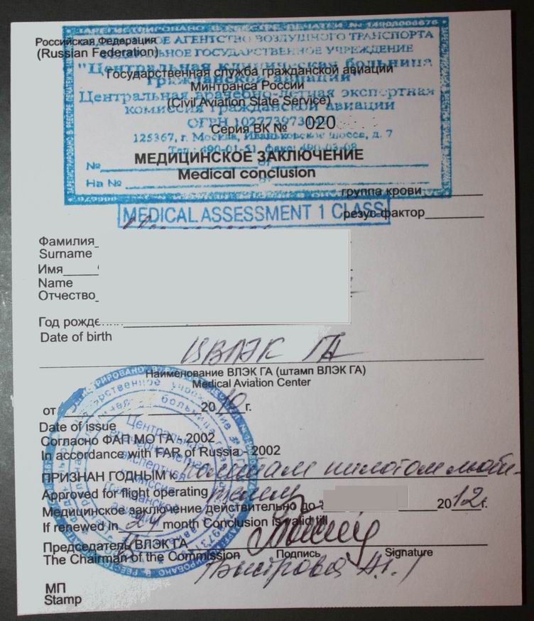 В результате выдали бумажку. На ней написано MEDICAL ASSESMENT 1 CLASS, и надпись: "признан годным к полетам пилотом-любителем".