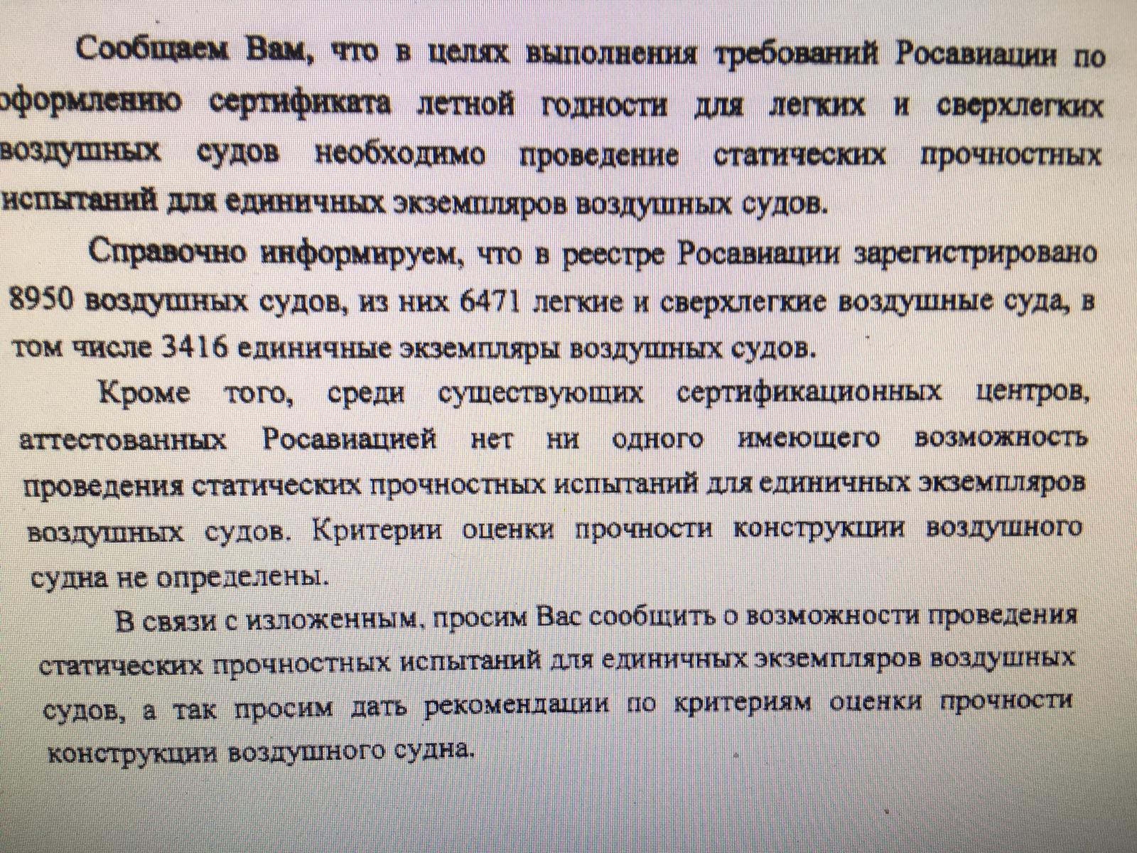 Вопросы в данной теме не задают. Тогда риторический: «Зачем Профсоз АОН хочет, чтобы проводились статические прочностные испытания всех ЕЭВС в России?» Грубо говоря, это означает угробить огромный парк ВС АОН. Ведь такие испытания проводятся на опытных образцах.