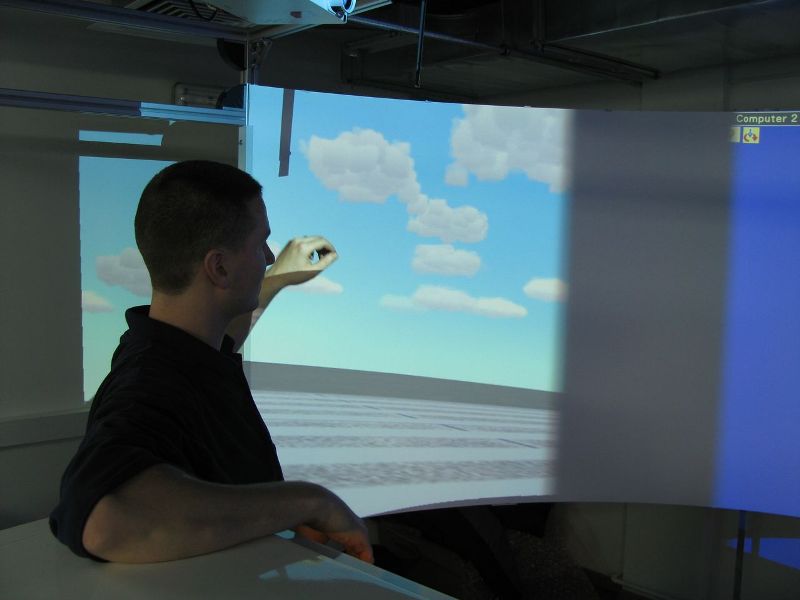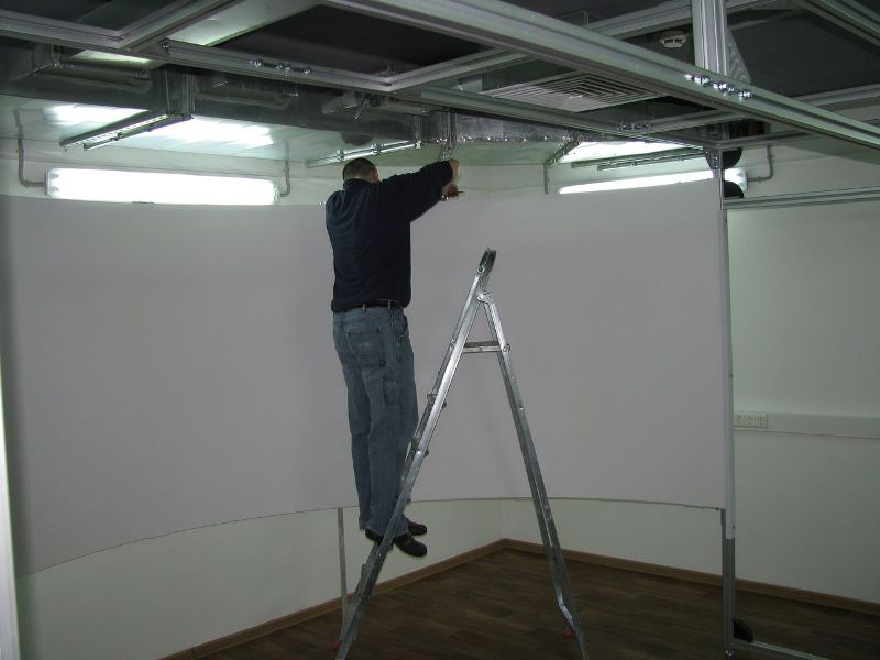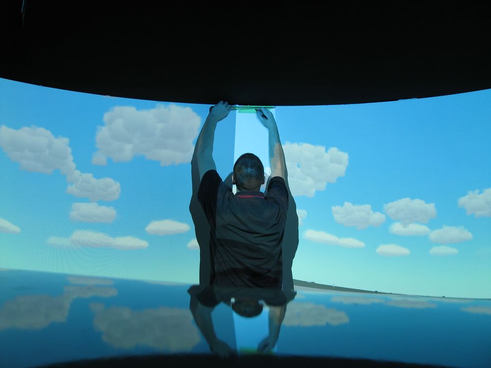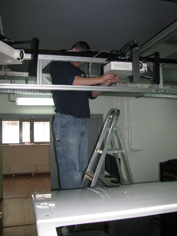 Погружению в виртуальную реальность помогают 3 проектора, которые необходимо точно настроить, что-бы картинка была единым целым, а не кусками разных изображений. На этот этап мы сегодня потратили почти 10 часов.