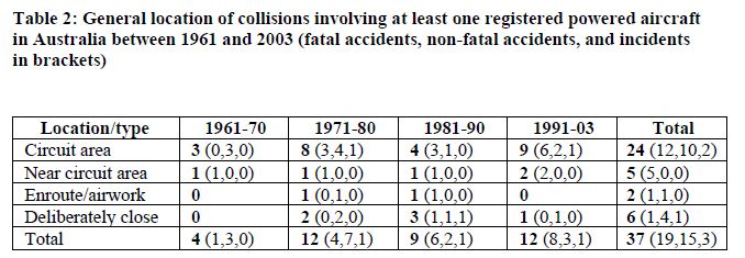 Австралийское бюро расследований происшествий на транспорте подготовило хороший анализ безопасности полётов в районе неконтролируемого аэродрома. За период 1961 по 2003 года в Австралии произошло 37 столкновений в воздухе (19 катастроф). Из 37 столкновений, 29 произошло на "коробочке". Местоположение столкновений показано красными точками: