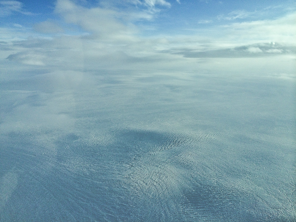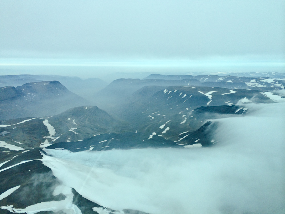 Стоит отметить, что Исландия фактически разделена на запад и восток горами-ледниками посередине. Похоже, что горы задерживают плохую погоду на востоке, в то время как на западе всё более-менее хорошо. Подлетаем к северной части горной системы. Она оказывается под нами. А дальше на восток – сплошная облачность и выше, и ниже, и на нашей высоте. На фото видно, как горы задерживают облака справа.