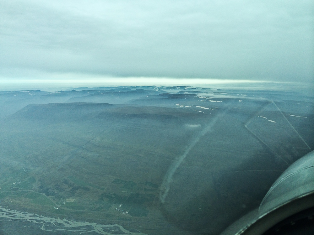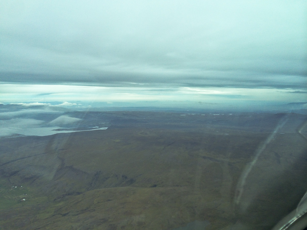 Решаем «пойти посмотреть» что там. У нас топлива хватит с запасом, чтобы облететь Исландию в два конца. Говорим диспетчеру, что отменяем наш IFR-план и переходим на визуальный полет. Это позволяет нам лететь гораздо ниже облаков и обледенения. Летим на север, изучая тем временем карты и рельеф Исландии. Впереди виднеются горы.