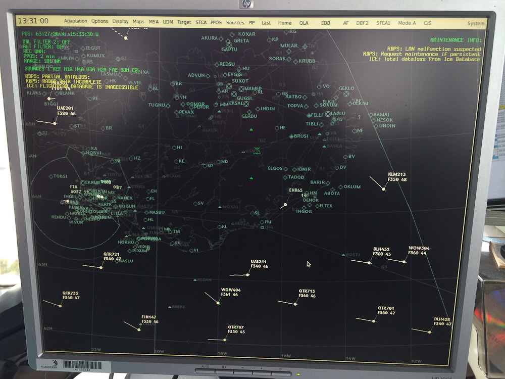 На экране диспетчера виден весь трафик страны (оборудованный ответчиками). В самом центре виден зеленый значок действующего на тот момент вулкана. Некоторым даже повезло с погодой его сфотографировать - очень эффектно его горячая лава светится ночью.