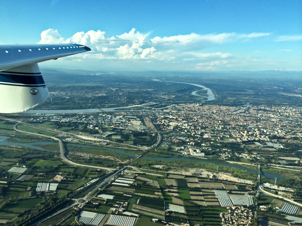 Всё это время мы летели по IFR-плану, и уже около Авиньона диспетчер вежливо поинтересовался, хотим ли мы делать полноценный приборный заход или можем зайти визуально. Конечно, чего время тянуть. Переходим на частоту Вышки в Авиньоне и слышим, что диспетчер как раз говорит желающему взлетать джету «ждать, потому что на подходе самолёт по IFR-плану».