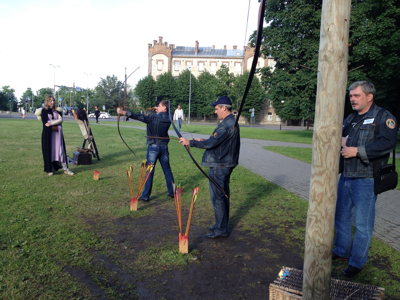 Со второй попытки нам удалось найти гостиницу со свободными номерами, но увидев ее столовую (ой ресторан) мы решили поужинать в городе. По дороге коротенько провели соревнования экипажей по стрельбе из лука