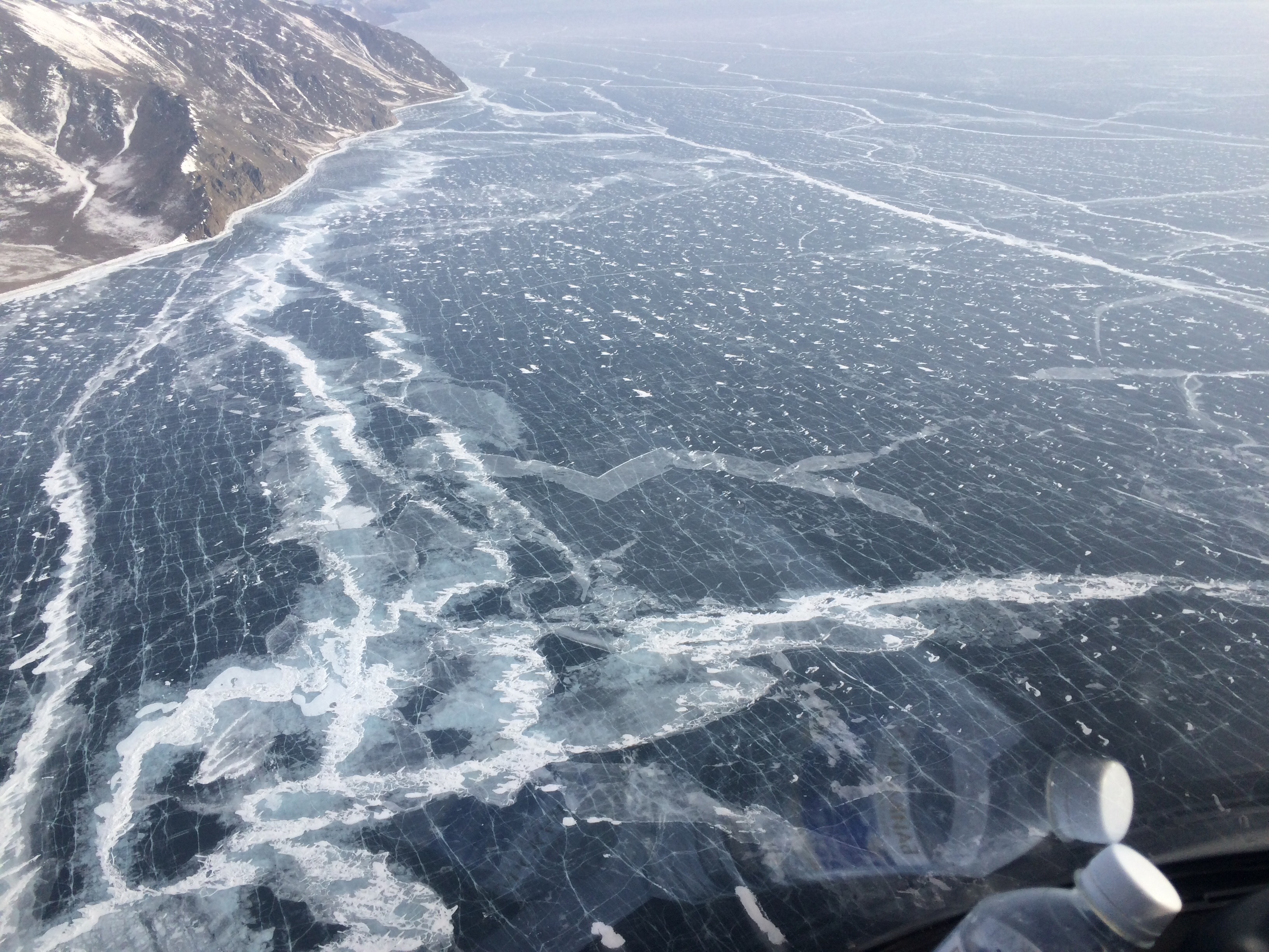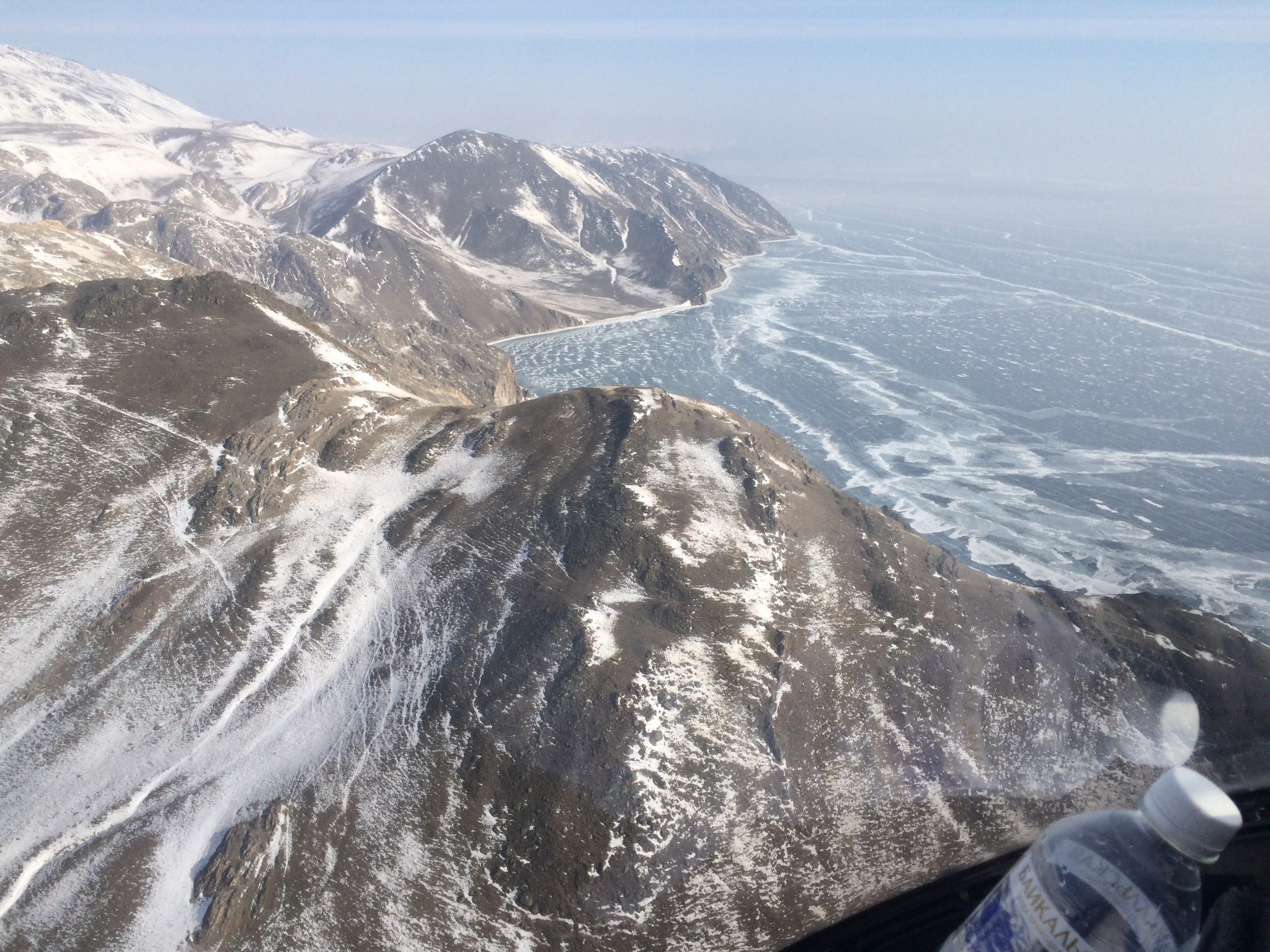 Салон замолк мы лавируем между сопок выскакиваем в тажеранскую долину. Уважаемые пассажиры можно расслабиться. Тут и солнышко выглянуло. И так посмотрите налево там вы видите памятник орлам, посмотрите вправо там в Байкал впадает река Анга. Мы замолкаем они пишут чистый звук. Регина просто кричит в гарнитуру от увиденного. Ныряем вниз к земле и выскакиваем на лёд.