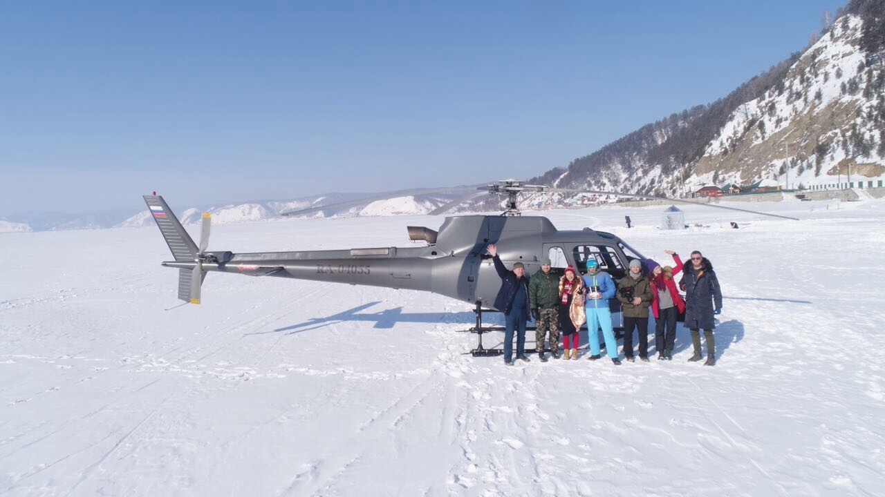 Садимся на лёд. Надо смотреть было как они выходили, каждый вновь ступающий на лёд до последнего держиться за вертолёт, ногу подкашиваются. Ещё бы чистый прозрачный лёд. Ощущение что ты стоишь над бездной и что тебя держит непонятно. Через 5 минут группу украинских товарищей пришлось вернуть в реальность, мы то своё дело сделали, но процесс съёмок никто не отменял а график уже сдвинулся вправо. Мы пользуясь паузой делаем с набежавшими и прикатившими на коньках, лыжах, буерах, машинах фотографии с вертолетом. Сегодня д выходной по всему малому морю снуют автомобили, вдоль берегов двигаються туристы. Через час закончив съёмки мы собираемся перелетать на место ночёвки в турбазу. Оператор просит снять вид из кабины на Регину. Мы как честные сразу предупреждаем она охренеет от создаваемого нами потока. Все предупреждены полетели. Оператор сидит привязанный всеми ремнями к вертолету, открыли дверь ему снимает, на втором круге Регину просто сдуло, она гонимая потоком от винта поскользила в сторону острова Ольхон. Съёмку на этом решили прекратить. Выбросив на лёд все барахло и со скрипом вернув паспорта телевизионщикам прощаемся до утра. Рекомендуем жирную пищу и одеть все тёплые вещи на себя, в глазах тоска, они понимают что только мы можем их оперативно вытащить в цивилизацию. И эх, мы зажгли, оператор аж присел когда вертолёт перестал помещаться в камере и промчался над головой на высоте 3 метров.