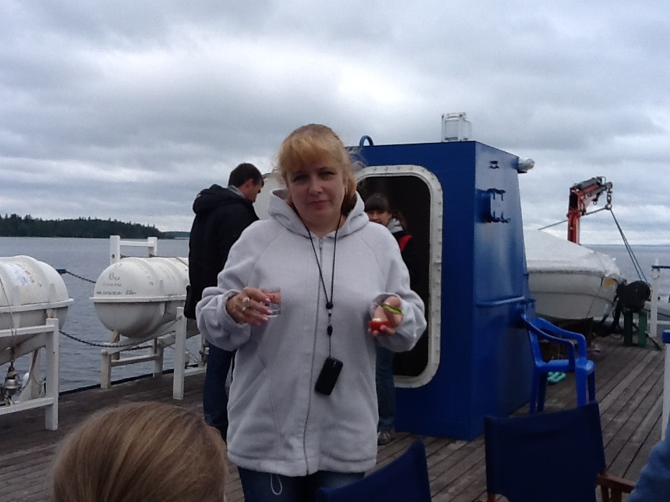 Еще пару фото с моего антипада. Любимая жена несет на верхнюю палубу настроение для мужа. В этом году скорость пароходика была (ну как бы сказать по мягче?) очень мала. Хотелось спрыгнуть в Онегу и подтолкнуть. По этому настроение приподнималось регулярно.