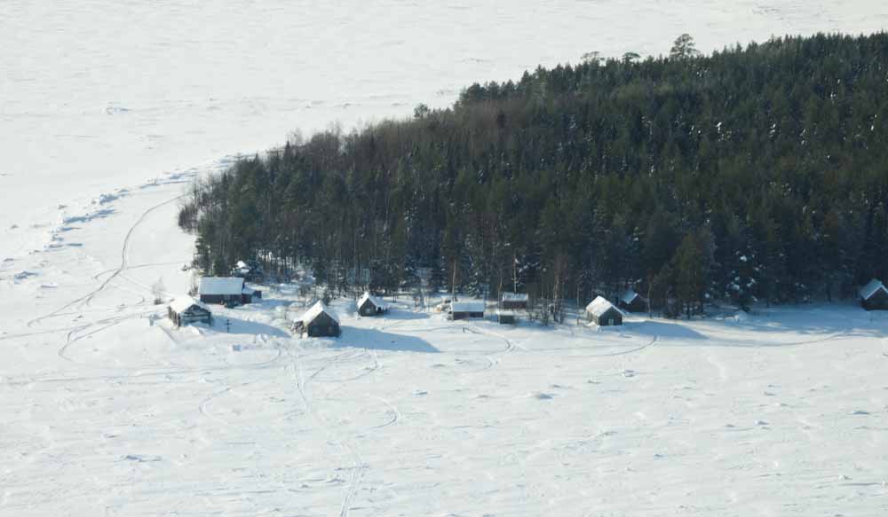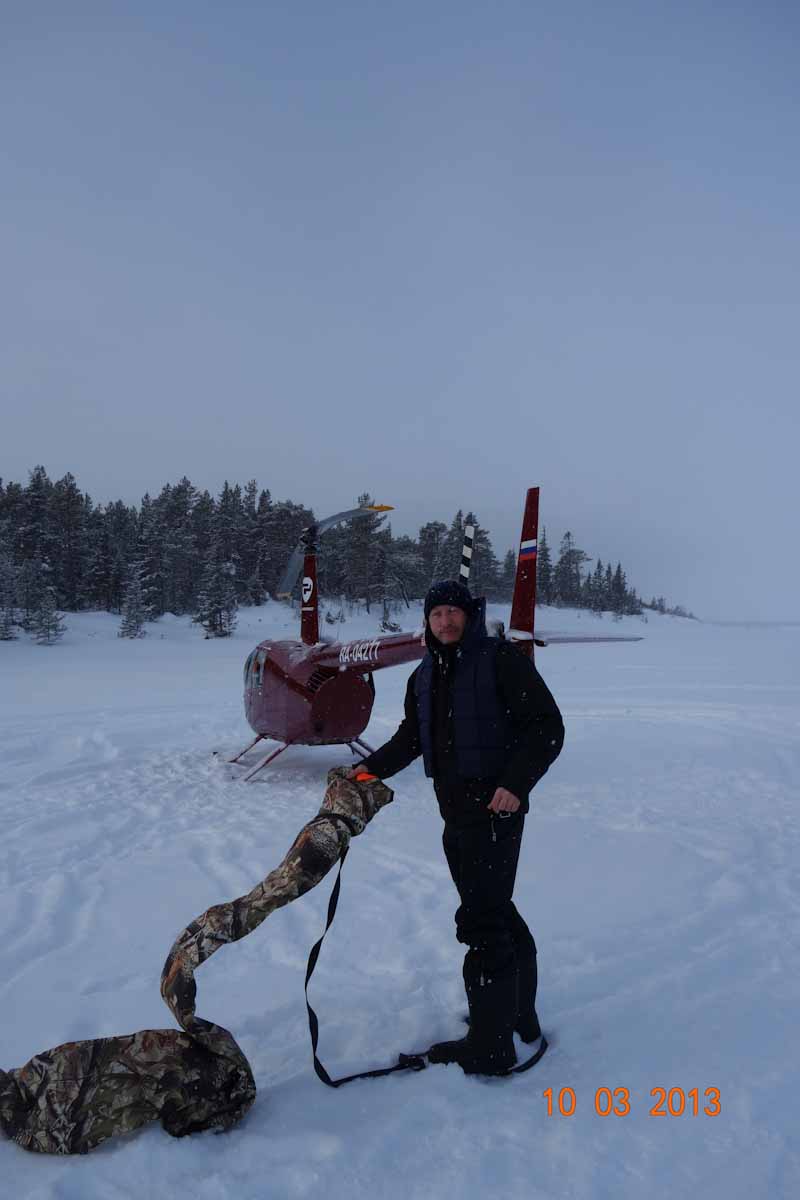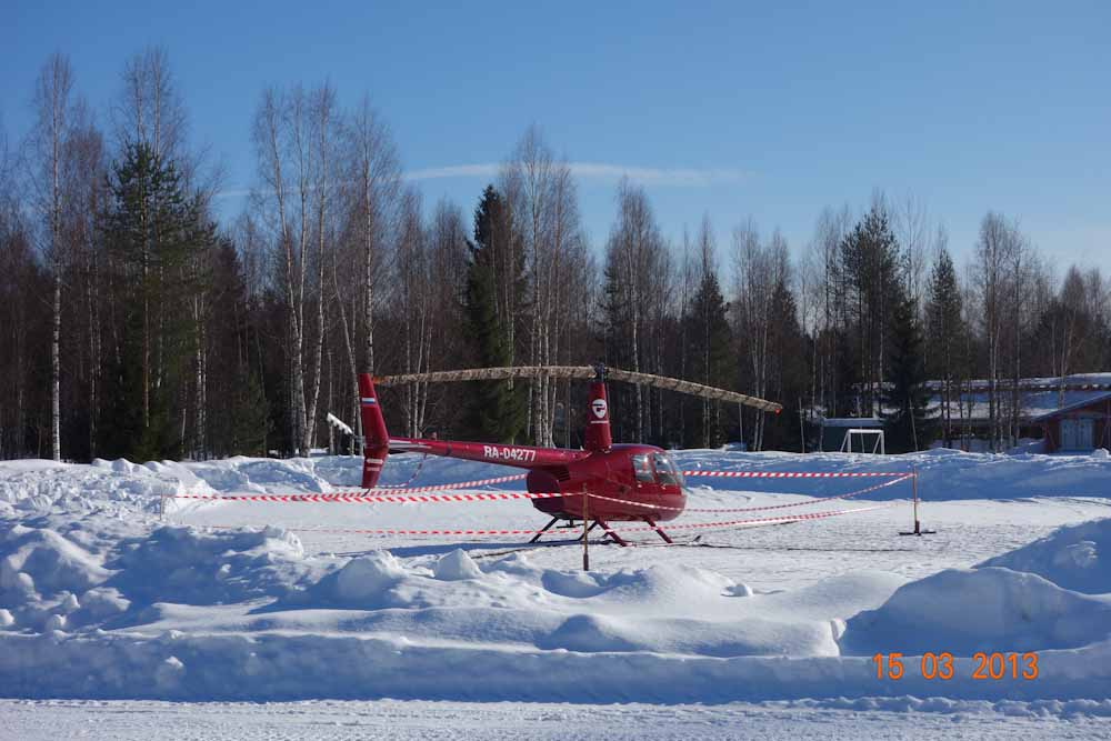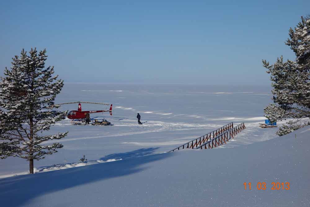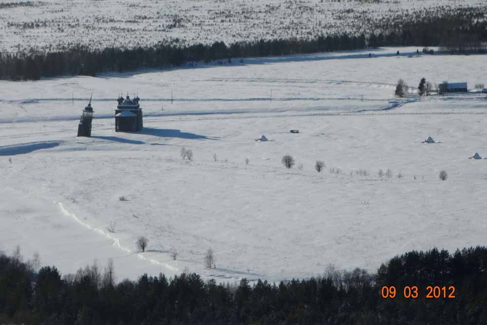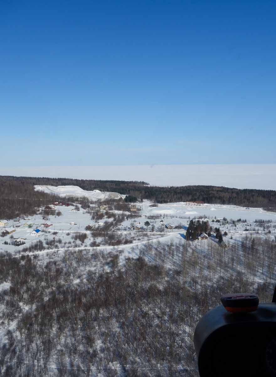 Расставались со всеми как старые друзья, отправились в обратный путь утром 14 числа, все было достаточно терпимо с погодой, топлива до Рыбреки было в обрез даже с двумя канистрами на борту, так как встречный ветер был всю дорогу в лоб 20-25 узлов... Срезали, где могли, над Белым морем, шли километров 10-15 от берега, все равно неприятно- полуприборный полет, высоту держишь по приборам, солнца не было и все сливалось, попадались снежные заряды. Видимость опять была не очень хорошей - 2-3 км, местами хуже. До Онежского озера - пустынные места! Редчайшие деревни, из растительности - только елки и редкие березки. Подлетая к Онежскому озеру, понимаешь, что это уже цивилизация и густонаселенное место, часто появлются следы животных. На берегу Белого моря следов животных очень мало, никто не хочет питаться елками. Пришлось из-за сильного встречного ветра заправиться на, чудом появившейся, лесной дороге недалеко от берега Онежского озера. Приняли решение лететь опять прямо через озеро, погода позволяла, при подлете к озеру распогодилось и светило солнце. Дима нас заправил и пригласил прилетать еще, нас и всех, кому нужно дозаправиться в этих местах.На волков в сугробах смотреть не пошли, слопали сухой паек, приготовленный нам Мариной Продан и замечательной Леной, прямо не выходя из вертолета и полетели дальше- в Мандроги, самобытную деревню на берегу реки Свирь между Ладожским и Онежским озерами. С удовольствием смотрели на деревни на берегу Свири - мы не одни!