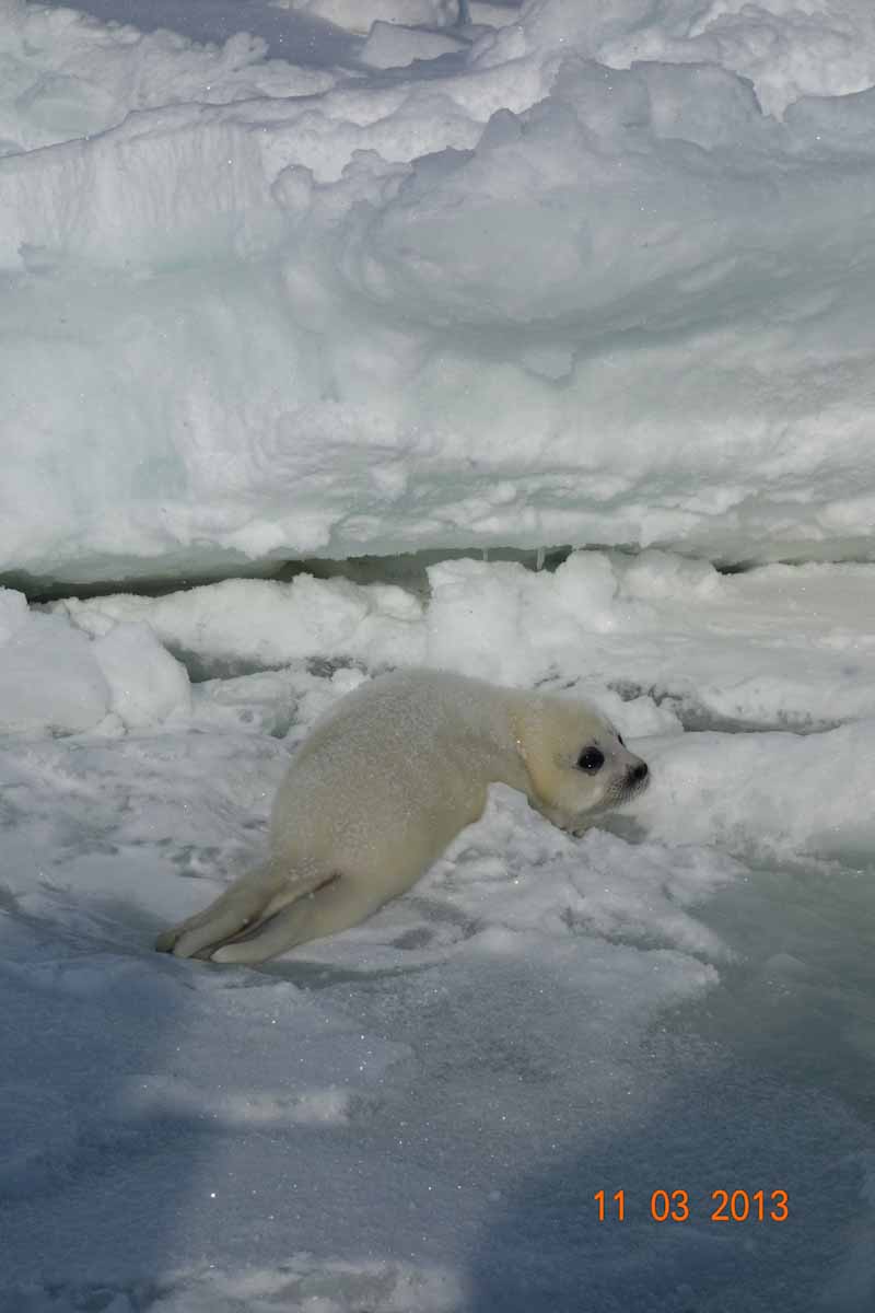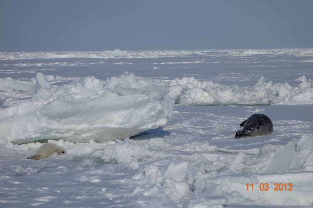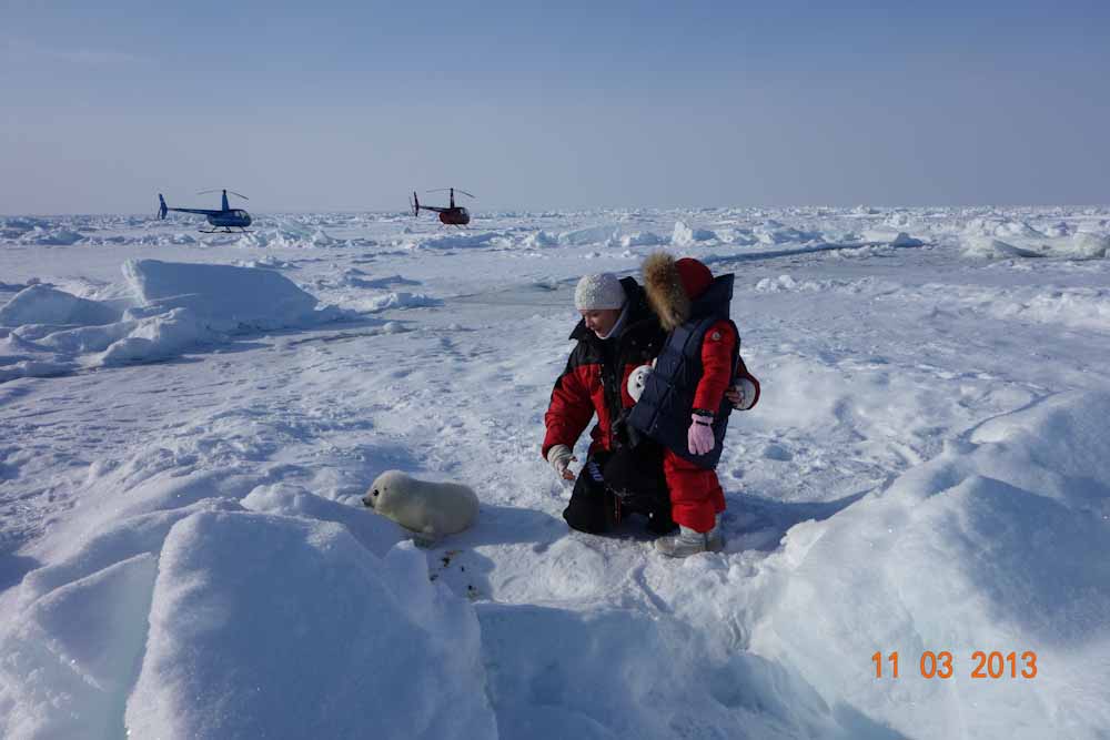 12 марта вылетали на льдину при прекрасной погоде везде! Сплошное удовольствие! Вообще, когда находишься на льдине, ощущение необычное. Дрейфуешь с тюленями потихоньку в полной тишине в нескольких километрах от берега вместе с вертолетом.... Нюся быстро запросилась на берег: " Давайте оставим бельков в покое, пусть их кормят мамы!"