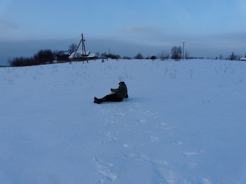 а вот дальше было не так весело. От вертолёта до дому 150 метро. Мы преодолевали это расстояние 20 минут. Ноги рухают и не вынимаются из плотного снега. Сначала пробовали идти как человеки разумные. Нас хватило на пару десятков метров. Потом сосед решил катится. Классно! Он совсем не проваливался, но через пять метров у него закружилась голова. :) Попробовали на карачках. Кое как доползли. Нет, это надо было видеть! Из вертолёта вылезли два мужика и на коленках поползли к деревне. "Наверное добавлять" - подумает сторонний наблюдатель. - "А кто же из них управлял вертолётом?".
