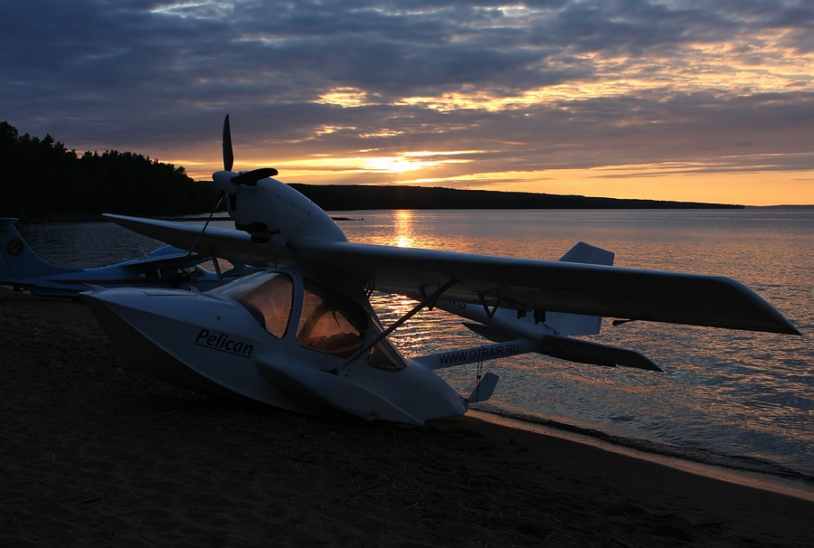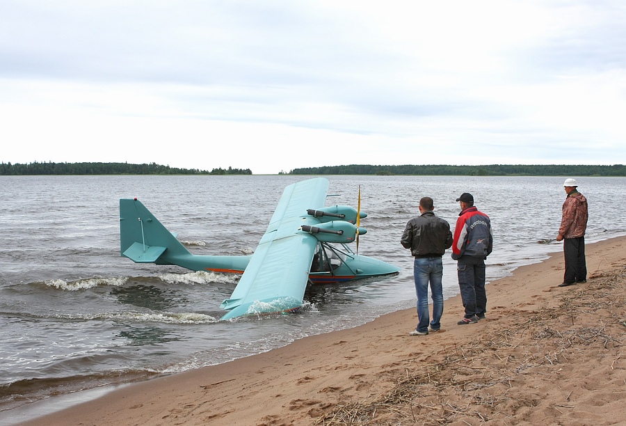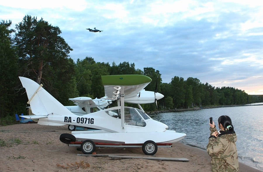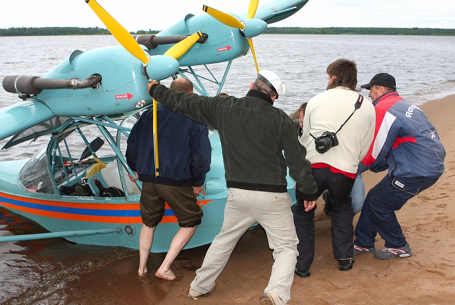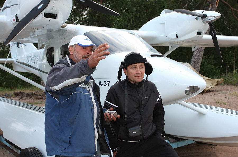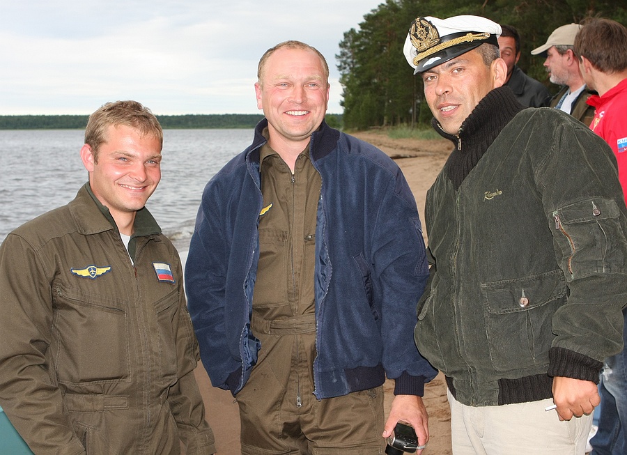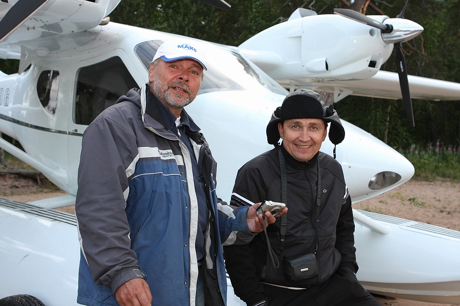 А вот и сам, - помогает вытащить аппарат на берег и фотографируется с пилотами-архангелогородцами: