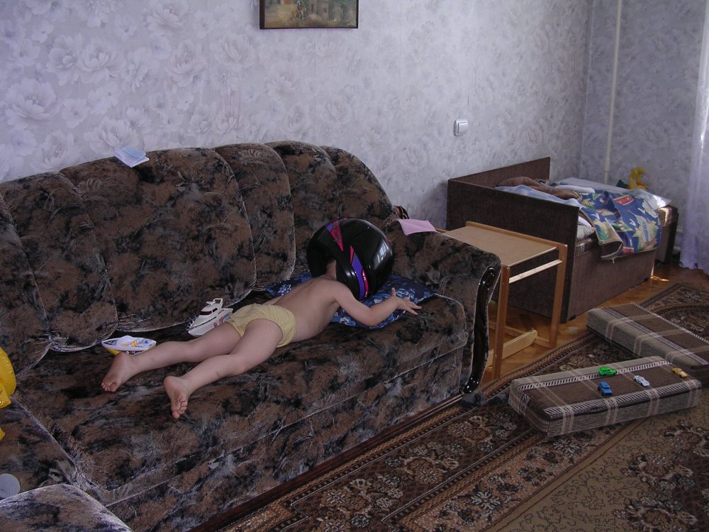 Нам 2.5 года было , и нам не нравиться когда что то непонятное давит на голову )))))