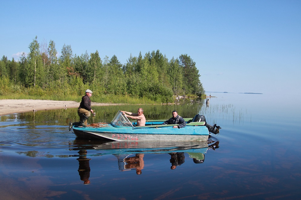 Еще на заходе, мы заметили лодку за соседним островом. Ребята ловили явно не на удочки и долго не решались к нам подплыть. Но любопытство взяло верх.