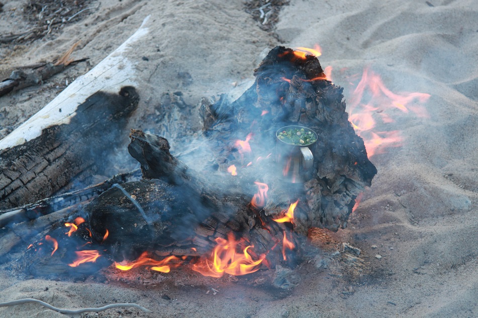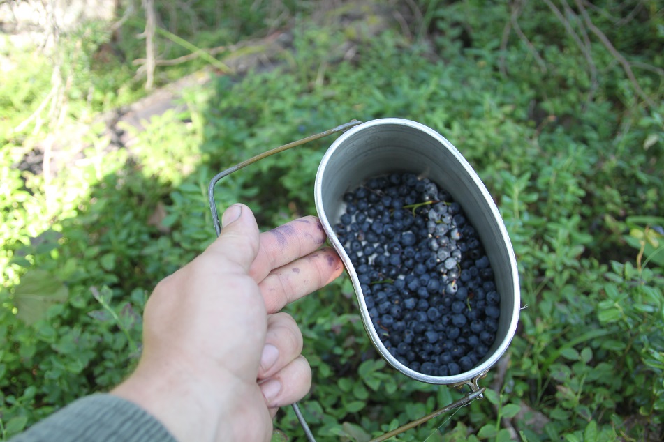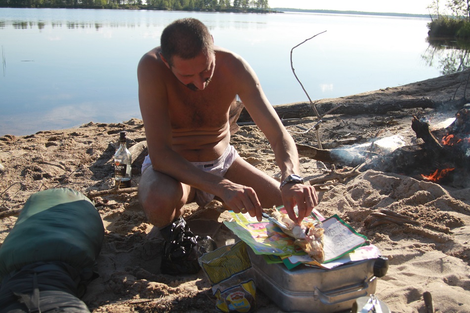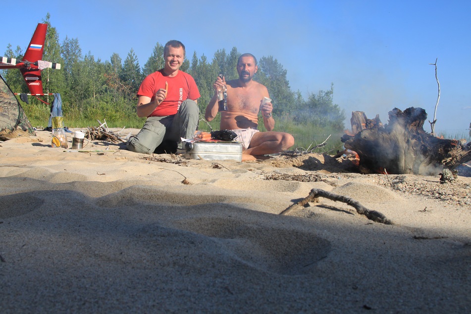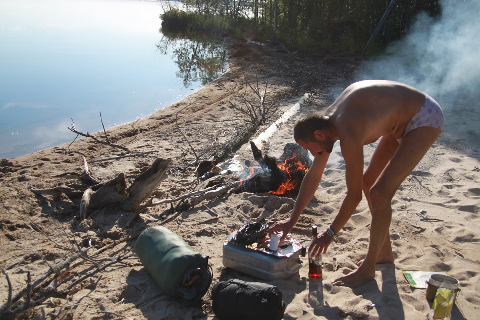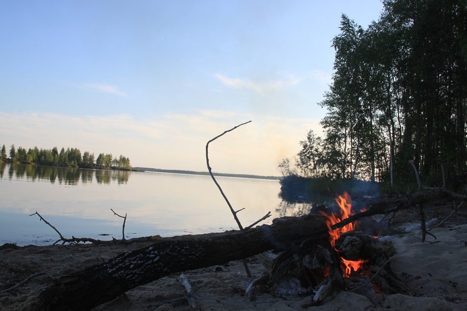 Судак подаренный рыбаками оказался весьма кстати. Я допустил оплошность при подготовке к перелёту взяв из продуктов только половинку черняшки, пачку сосисек и пакет огурцов с огорода. Судака приготовили как первобытные люди посолили и как то очень быстро съели. Запивали чаем(компотом?) из брусники собранной Андреем. Было очень тепло. Вечер наступал, усталость давала о себе знать. Мы наложили в костёр брёвен и быстро отрубились.