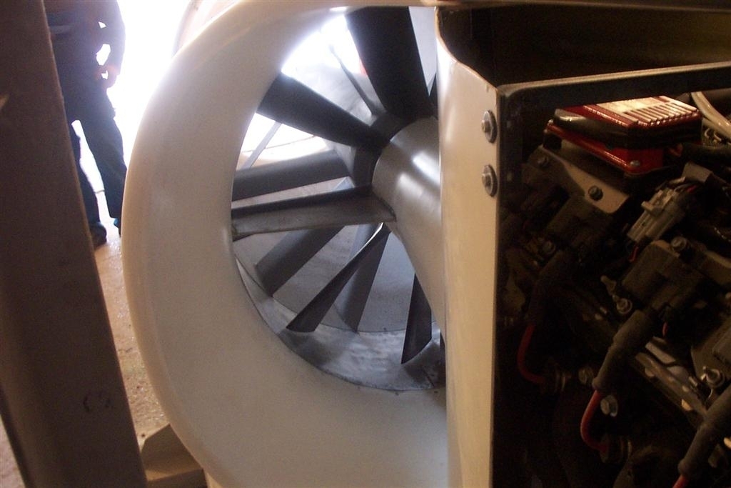 Что-бы создать тягу в 350-400кг(для энерго-вооружёнрости 0,3) нужен был двигатель мощьностью в 350-400лс. На рынке уже был такой двигатель. Это была автоконверсия двигателя "General Мotors" LS-6. По расчёту он должен был "крутить" девяти лопастной вентилятор диаметром 960мм на максимальных оборотах 4500 и без редуктора: