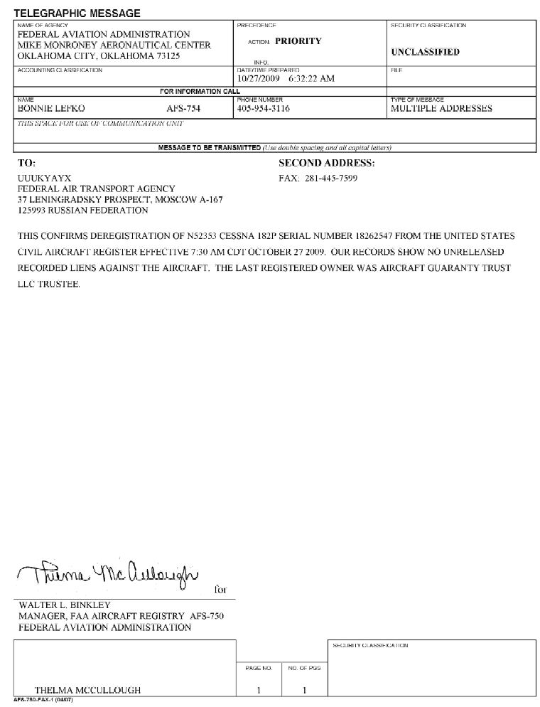 Но эту телеграмму в ГА никто не может найти и ГИ требует ее от владельца, поэтому когда снимаете с учета указывайте SECOND ADDRESS, чтобы копия была отправлена на ваш факс.