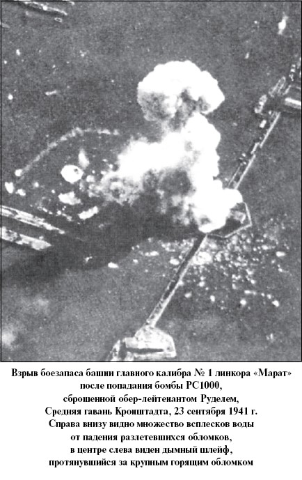 Гауптман Штеен, который за несколько мгновений до этого был вынужден взять ручку управления на себя, чтобы увести свой Ju-87 немного вверх и тем самым избежать столкновения с машиной Руделя, уже не успел точно прицелиться. Сброшенная им бомба упала в воду около левого борта «Марата». Прогремел взрыв, и огромный корабль под действием возникшей волны начал крениться на правый борт. В этот момент в палубу линкора перед носовой надстройкой с фок-мачтой попала вторая бомба, сброшенная Руделем. Ее взрыв вызвал детонацию боезапаса в артиллерийском погребе башни главного калибра № 1. Последовал гигантской силы взрыв, мгновенно унесший жизни 326 моряков из команды: «Марата».