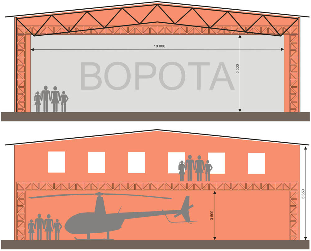Я подумал, что лучше всего в противоположном от входа конце ангара соорудить "балкон", на котором разместить помещения. Заодно, сделав окна и наружу здания - для дневного света, и внутрь - для обзора ангарной площади. Но как сделать безопорный балкон? Не стоило строить однопролетные сооружения, если внутри все равно ставить какие-то столбы. Подвешиваться за крышу - нельзя. Она не рассчитана на иную нагрузку, кроме снеговой. Делать снизу подкосы (укосины) тоже не желательно. Подкос - практически тот же опорный столб, только чуть поудобнее. Соответственно, сейчас решается, как будет устроен балкон, чтобы не касаться пола. Есть мнение, что системы удержания ворот и удержания второго этажа будет аналогичными - длинная и мощная ферма. Впрочем, о технических решениях ниже, когда инженер и архитектор просчитают конструкцию.