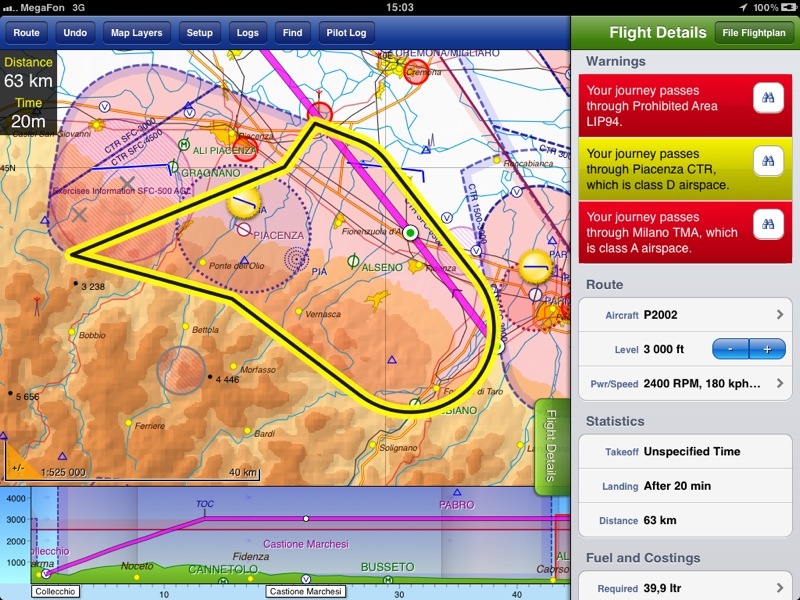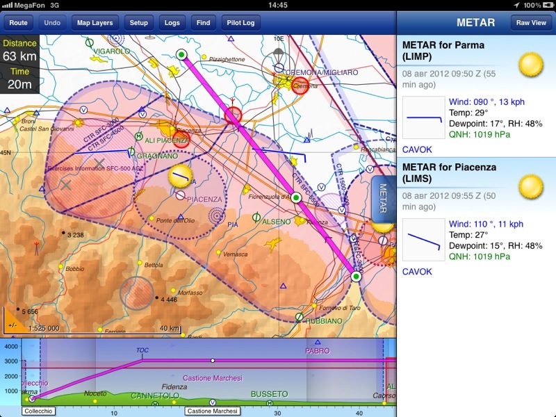 Преодолев последний горный хребет, начали снижаться, впереди была равнина, которая лежит между Альпами на севере и Апеннинами на юге. Через некоторое время Гармин начал сообщать, что впереди зона военных полетов. Я ее определил по карте Гармина как большой прямоугольник с границами фиолетового цвета и приделанный к ему круг с границами синего цвета с центром в точке NDB Пьяченца. И принялся их старательно облетать. Позже выяснилось, почему я не мог связаться с Милан-информация - у них в этой зоне хронические проблемы со связью, да и горы точно не способствуют распространению радиоволн.