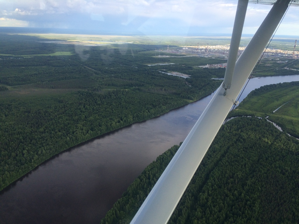 Скорость не растет ветер встречный боковой да что ж за напасть та такая, в воздухе спокойно не считая что постоянно приходиться упираться педалями и креном. Да так мы будем 4 часа педалить минимум если не больше,а скорее даже больше. Под нами река, народ уже с удочками сидит отдыхает, утро все таки на зорьке на рыбалку вышли, везет им. Подходим к границе пермского края а красотища то тут река бежит среди небольших скалистых берегов, делаем или пытаемся делать фото, Дима на радостях что он второй день сидит в качестве штурмана нашел фотоаппарат который я предусмотрительно по вешал на спинку сиденья летчика, что б было удобно его доставать, строчит как из пулемета, Так сюда до вернись потом сюда. Опа нас зовут, аэрофлот забыл что они говорят только на английском перешел на русский и вызывает нас, отвечаем, подскажите где вы, мы в 30 минутах от траверза Нижнего Тагила, а точку выхода можете подсказать, можем рубеж рассчитываем через час, а точку? какую? такую? нее не можем, не могу найти эту точку оперативно, даю еще раз нижний тагил, прошу дать екатеринбургу, аэрофлот передает и уходит обратно на английский. Впереди самое веселое начинается штурм горок, пока трепались подъехали почти вплотную, с такими характеристиками мотора в лоб гору не возьмешь, прибавляем ага полез родной, до вершин еще минут 15 топать а за ними сразу с лева траверз Тагила. Время до прохода точки не уменьшается а увеличивается. лезем в горку с запасом, посматриваю по сторонам если что куда сыпать. По бокам есть места где можно прислониться и даже удачно посадить самолет. Набрали, еще минут 10 проходим до вершин, и вот она азиатская сторона нашей бескрайней родины, теперь только вниз, возможно даже будет попутный, размечтались, прогноз по ветру подтверждается на глазах. Спустились с горок нижний край нас придавил к земле. Урал в этих местах да не высокий но тоже интересный, со стороны Перми идет холмистая местность с перелесками, речками, и ближе к Нижнему Тагилу появляется хребет который надо перевалить, высота не критическая, но встречный, и крейсерская скорость нашего аппарата делает данный перелет запоминающимся. Ну во общем пересекли впереди будет еще одна гряда но это уже в Кемерово, можно расслабиться и смотреть по сторонам. А по сторонам заводы, маленькие городишки, рабочие и не рабочие предприятия. Прошли траверз Екатеринбурга, нижний край 200 метров. Принимаю решения, идем на восток до точки два часа. Впереди есть и поля и леса но больше все таки пока полей, посмотрим что будет дальше. Через час докладываем вход в зону Тюмени. в воздухе уже почти 4 часа. а еще топать 40 минут минимум. Топливомер показывает погоды в Австралии. На улице жара, плавиться все, самолет просто не летит вязнет в воздухе, пробуем подняться повыше, думка уменьшает горизонтальную видимость. Ладно еще немного еще чуть чуть, и зачем я оделся тепло в перми. Димон уже разделся сидит в майке и то ему жарко. Проскакиваем траверз Тюмени, удаление 20 минут, просим дать частоту аэродрома почему то в ФПЛН ее нет, нам сообщают приятное аэродром сегодня как площадка, решение принимайте самостоятельно. Ну и хорошо, как потом оказалось не очень хорошо, в воздухе летал учебный борт на частоте аэродрома. Выходим на прямую, делаем проход, вспоминаю что я видел со спутника как выглядит аэродром ага точно вот он с тремя 