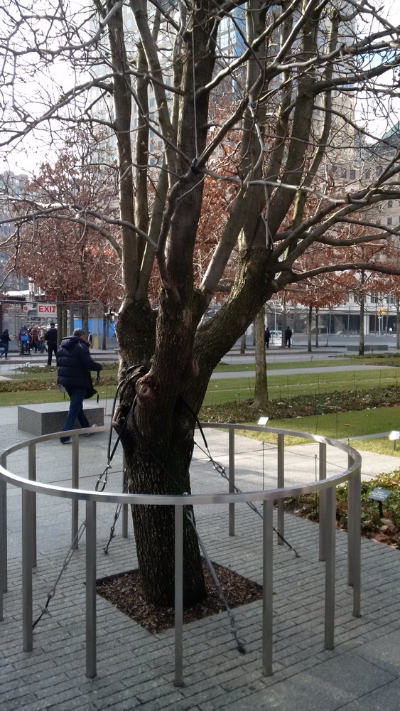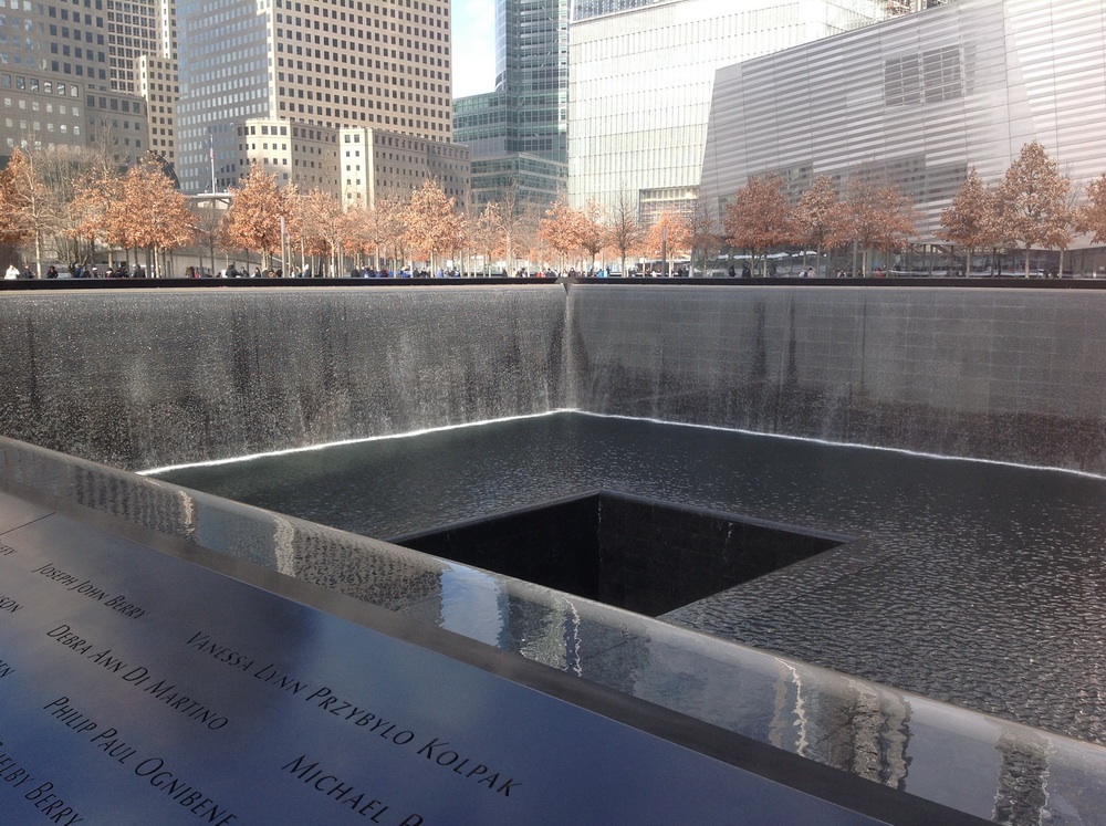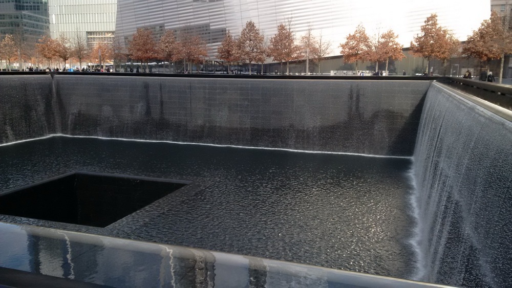 Собственно плана особого небыло, я просто шел и глазел. Когда нумерация улиц подошла к 30, где должны были стоять башни близнецы , которые были разрушены 13 лет назад, я внес поправки в свой маршрут и отправился к точке "0". Указателей было достаточно, вход был бесплатный, но собирались пожертвования. Опустив 10$ купюру я проследовал на территорию монумента памяти жертвам. Три года назад, я видел эту территорию при полете над Нью Йорком на маленькой цессне.