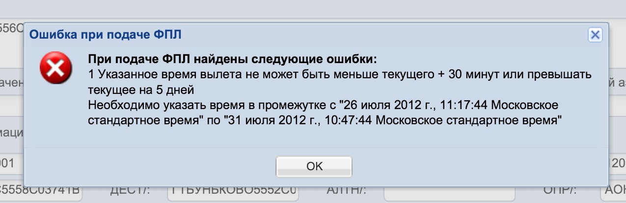 Перед отправкой окно проверяет план на корректность и при наличии ошибок выводит сообщение. Например Сообщение для полей дата и время вылета: (до вылета менее 1 часа)