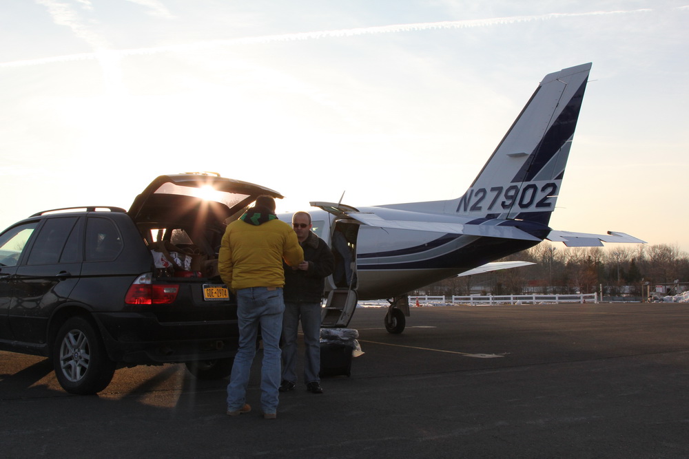 Через двадцать минут мы были у самолета. Меня ждало некоторое разочарование,- вместо привычного удобного вида салона я увидел беспролазное нагромождение коробок, все выглядело как в кузове перевернувшейся газели набитой коробками с посылками. Егор принялся наводить порядок, пытаясь разсовать все по компактнее. Для продуктов я выбрал коробку побольше и настоял что бы ее оставили именно для этой цели, а не раскидывали три десятка пакетов по всему самолету. Егор долго мялся но все же согласился, потому как на его предложение оставить всю еду в пакетах я отреагировал категорически, я представил себе картину из разбросанных по всему самолету соков и йогуртов и скривил такую физиономию, что противостоять мне было невозможно. Через час трамбовки и подготовки мы были готовы вылететь. На аэродроме был еще один участник процесса подготовки- Сергей, местный русский любезно предоставивший нам в временное пользование свой автомобиль. Солнце уже зашло когда мы запустили двигатели. Я был сзади, наводил порядок с прдуктами в любезно предоставленной мне коробке. Даже не взирая на ее внушительные размеры, продукты вместились в нее не все. Первым делом мы сделали небольшой перелет на соседний аэродром где залили полные баки,- топливо там было значительно дешевле. И уже потом мы снова забрались в салон , перекрестились и полетели дальше, над Нью Йорком уже было темно.
