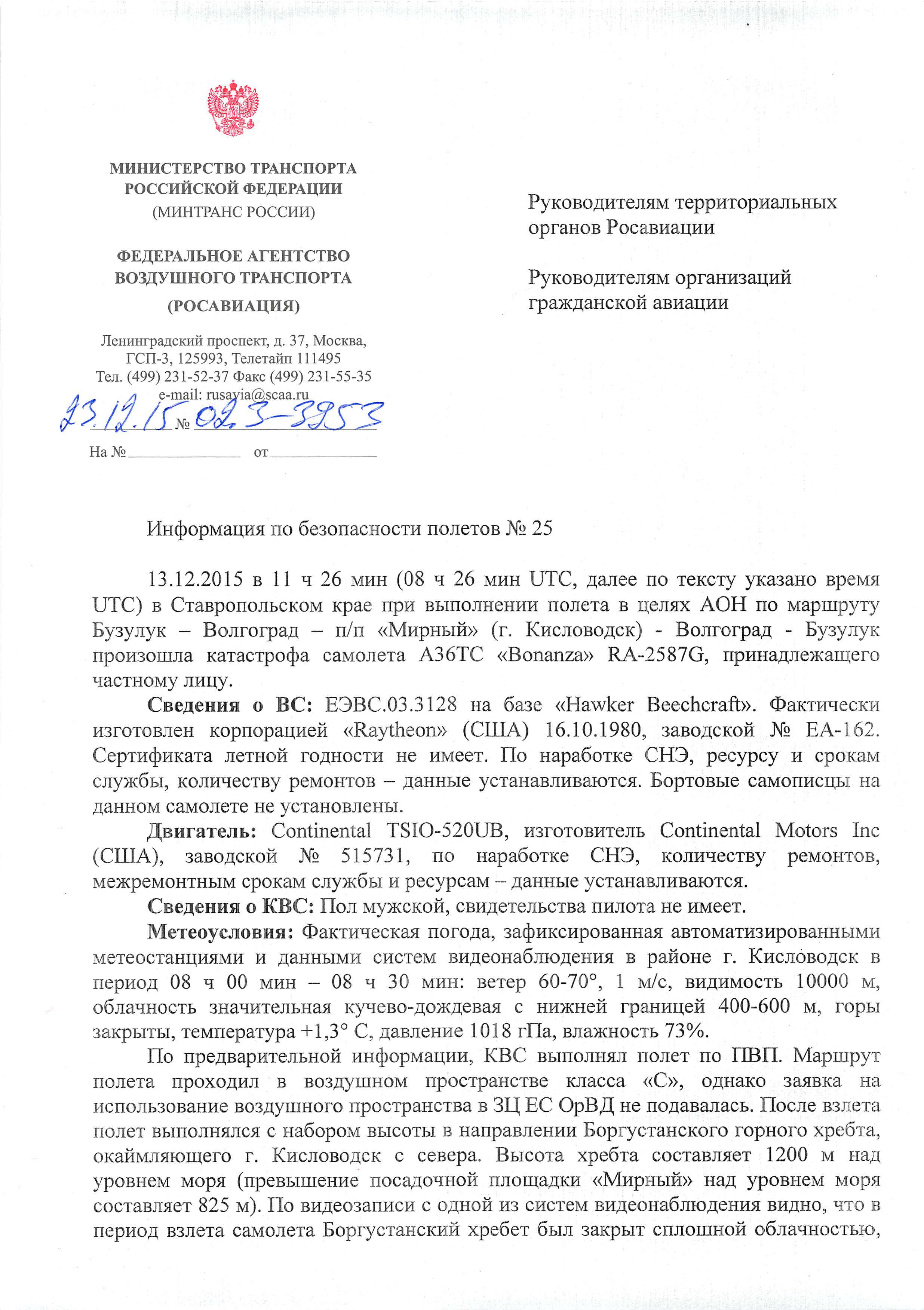 ПОСЛЕДУЮЩЕЕ ДОНЕСЕНИЕ ОБ АП С САМОЛЕТОМ А36ТС «BONANZA» RA-2587G