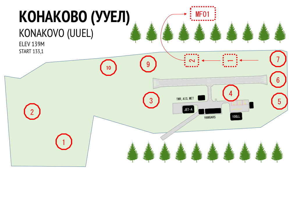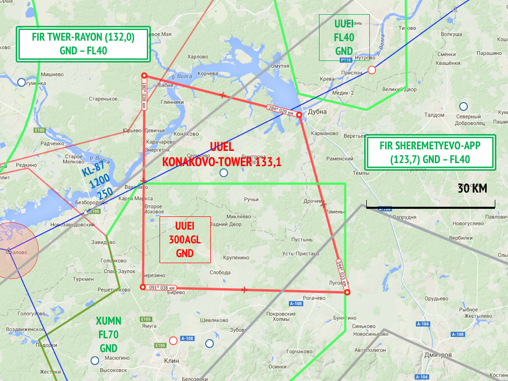 - - Заход на посадку с курсом 260, 4-й разворот на удалении 15 км от торца ВПП, связаться на 133,1 Конаково-Старт, далее по указанию ATC.