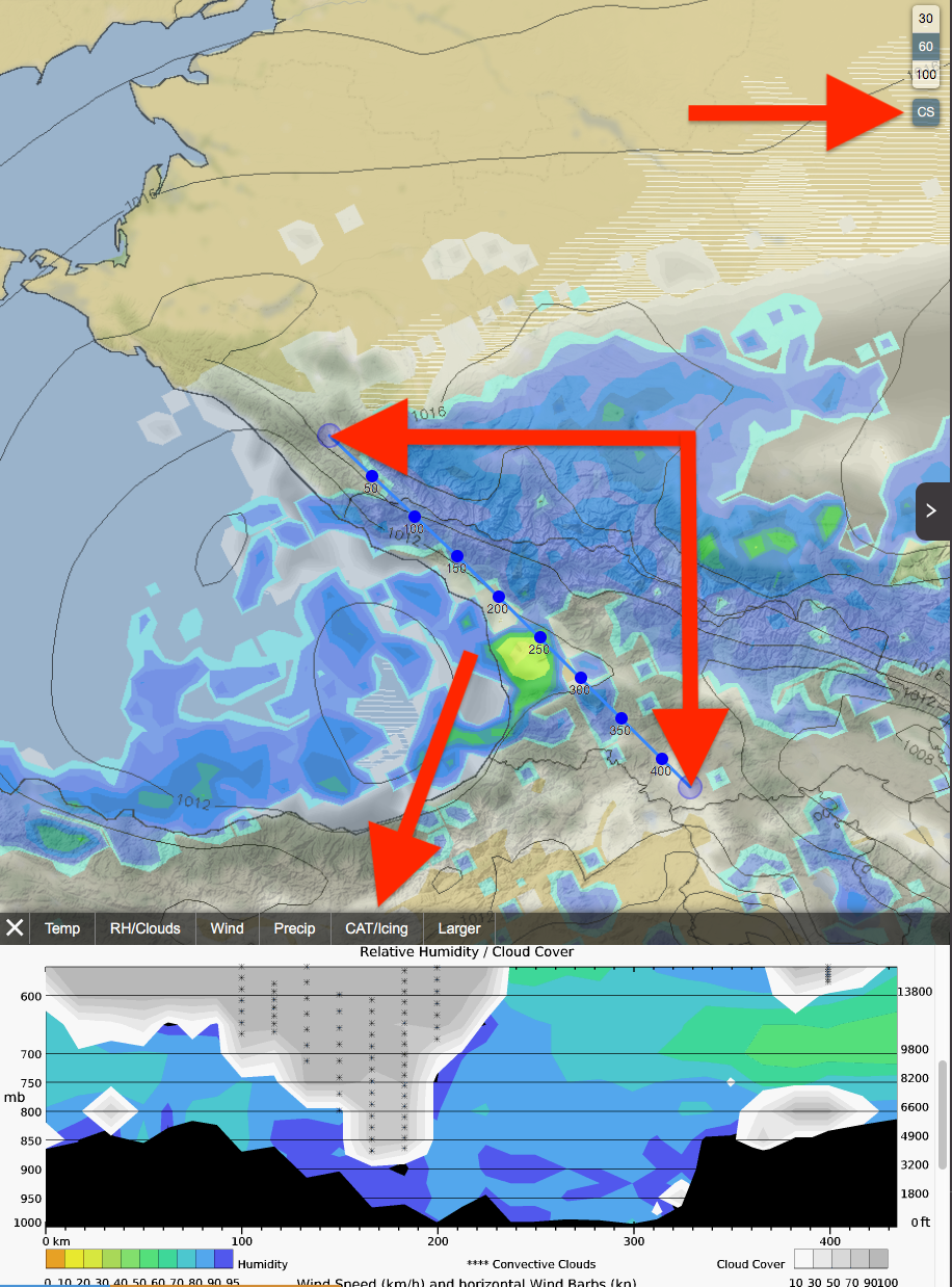 В правом верхнем углу есть малозаметная, но очень полезная кнопка "CS", нажав на которую пользователь получает возможность построения на карте маршрутов любой сложности, для последующего создания метеограмм.