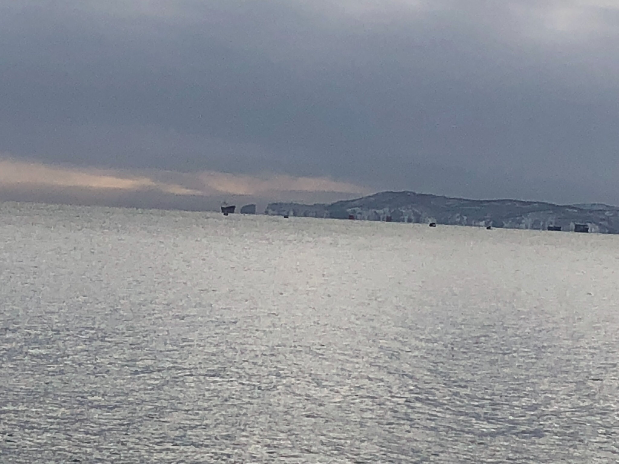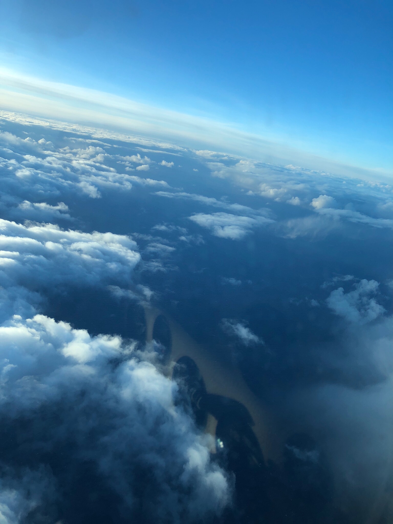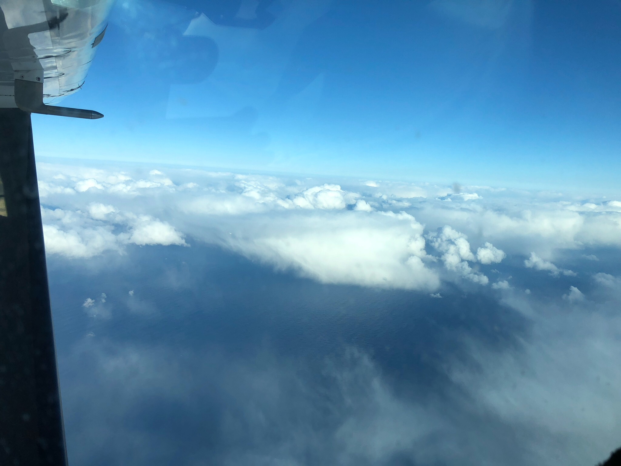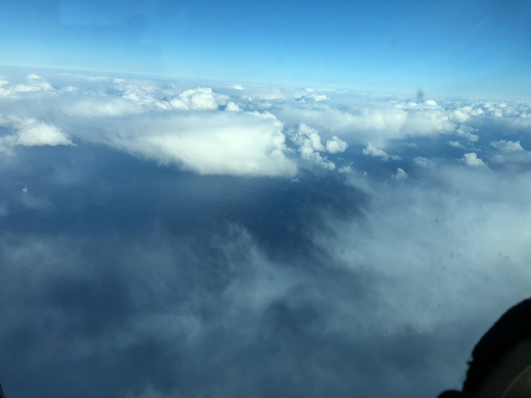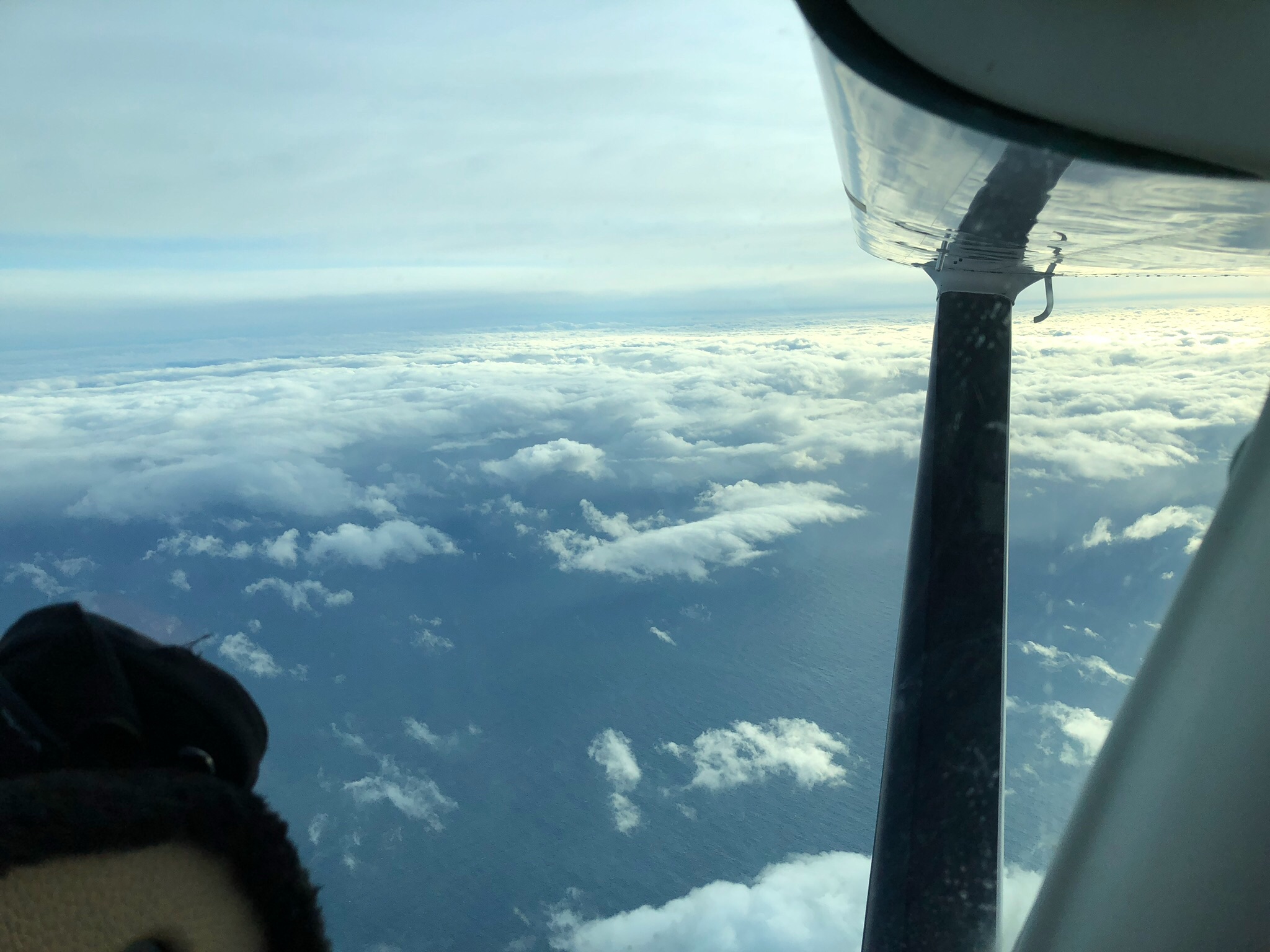 И вот мы сидим в самолете в гидрокостюмах. За бортом -30. Взлёт. Набор высоты на 130 эшелон прошли облака. Материк закончился. Расстояние до сахалина 114 км. Сидим не дышим. Самолёт летит, автопилот работает. Вот уже сахалин прошли и впереди 900 км бескрайней воды. На самом деле ее не было видно только местами просвечивали облака. И на навигаторе синий экран.