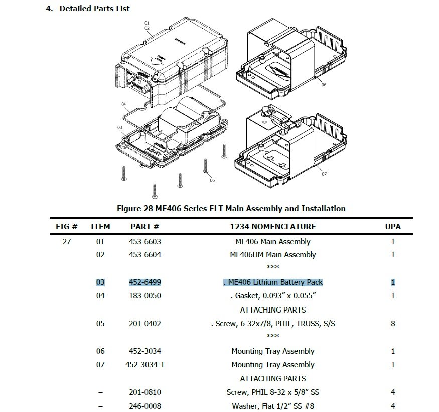 2) Parts and components not listed herein, are not field replaceable and ELT repairs requiring parts outside the scope of this manual must be accomplished by the manufacturer.