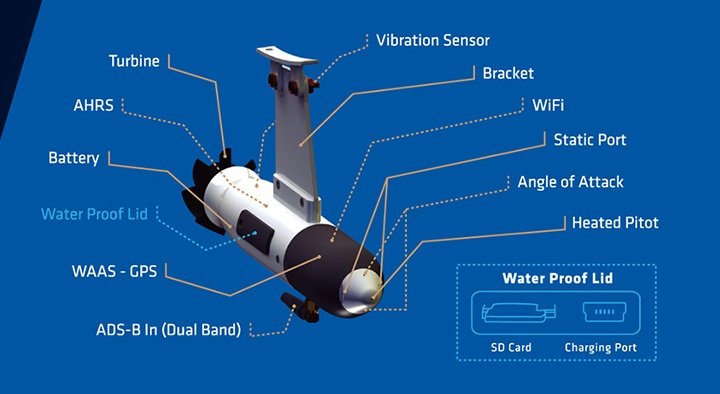 В том-то и дело, что никак. Первоначально дома можно зарядить встроенный аккумулятор обычной USB-зарядкой. При запуске двигателя прибор просыпается от вибрации и работает на аккуме. Потом после взлёта прибор работает от встроенного генератора-турбинки, заодно заряжая аккуму. Замкнутая система, никаких проводов.