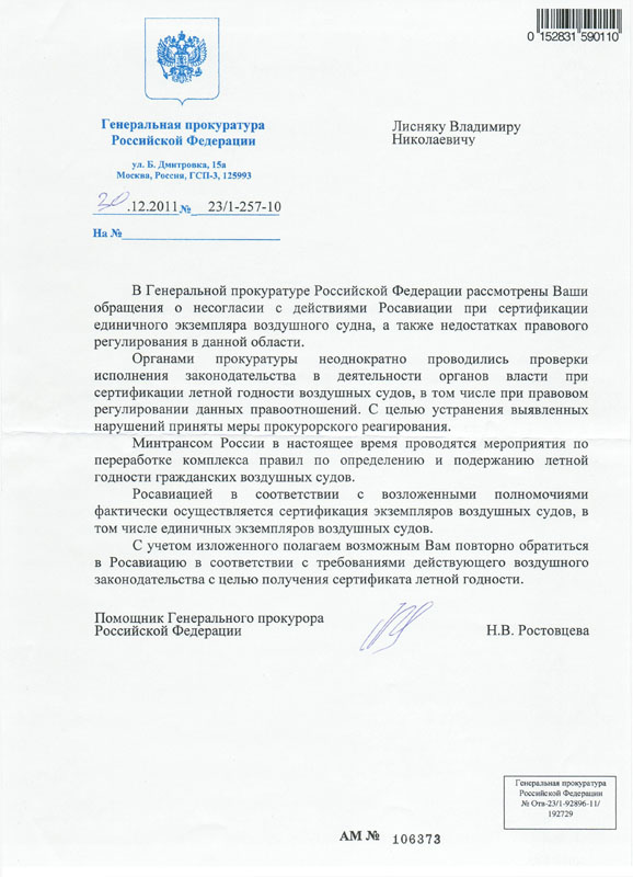 А вот что думает Генпрокуратура по сертификации самолёта принадлежащего Vovacii.