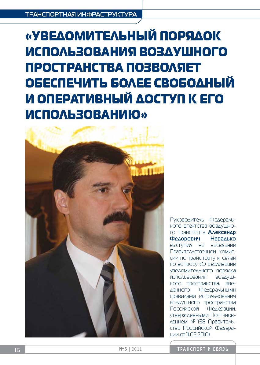 Введение уведомительного порядка потребовало достаточно серьезной работы, связанной как с корректировкой объемного массива нормативно-правовой базы, так и с оптимизацией структуры воздушного пространства. С.Б.Иванов сообщил, что такая работа при координации Минтранса проводится, однако при этом имеется ряд нерешенных проблем. Он остановился подробнее на одной ключевой проблеме. Успешное внедрение уведомительного порядка использования воздушного пространства зависит от оптимизации элементов его структуры. Что необходимо оптимизировать? В первую очередь, речь идет о районах аэродромов, зонах ограничения полетов, запретных зонах, установленных в интересах силовых ведомств, Роскосмоса, Минпромторга и других. Основной объем ограничений в таких зонах и районах установлен в интересах Минобороны. Особенно остро данная проблема стоит в Московской зоне ЕС ОрВД. И здесь, по словам С.Б.Иванова, «мы сталкиваемся с ситуацией, когда пользователи, в интересах которых установлены упомянутые элементы структуры воздушного пространства, не заинтересованы в оптимизации их границ. Я прекрасно понимаю важность вопроса безопасности полетов. Но, как правило, в подобных ситуациях торжествует принцип «сам не гам и другим не дам». Наиболее яркий аналогичный пример – конверсия радиочастотного спектра». Поэтому основная задача Комиссии при решении данной проблемы – найти баланс между безопасностью полетов с учетом позиции госструктур и интересами других пользователей воздушного пространства. Подробнее о ситуации с реализацией уведомительного порядка, существующих проблемах и предложениях по их решению в ходе заседания рассказал руководитель Федерального агентства воздушного транспорта Александр Васильевич НЕРАДЬКО.