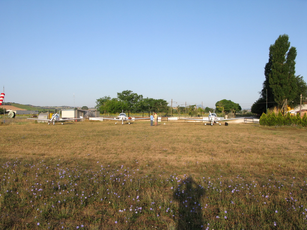 Запускаемся и греемся. Быстро забиваю в гармин ближайшие точки маршрута. Поехали….мы рулим первыми, на радиочастоте местного аэродромчика идет какой-то радиообмен на английском и итальянском. На полосе сидит самолетик, не взлетает. Мы стоим на предварительном, проверяемся, самолетик, убедившись, что мы ему на полосу не вылезем, начинает разбег, отрывается и уходит в жаркое небо. Выруливаем и трясемся по неровностям, чтобы занять исполнительный, надо порулить по всей полосе. За нами рулят RA и Foxtrot, занимаем исполнительный, соответственно при развороте Foxtrot оказывается лидером, RA за ним, ну и мы сзади. Еще одна проверка, подтверждаем готовность и Foxtrot начинает разбег. Взлетает тяжеловато – жарко, полные баки, начинает неспешный набор высоты. RA начинает разбег, отрывается, наступает наша очередь, газ вперед, побежали. Скорость растет медленно, самолет начинает уходить с полосы – ветер чуть сбоку, подпрыгивает, еще раз тыкается колесами об землю и переходит в набор. Наше путешествие началось…..