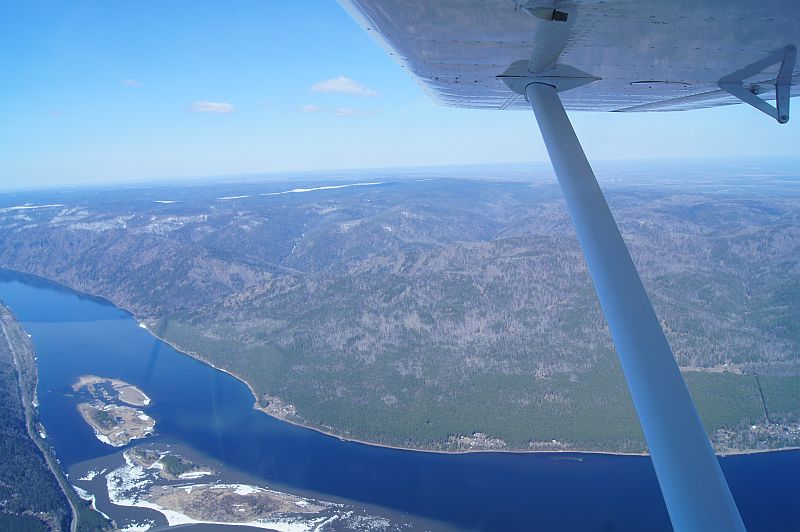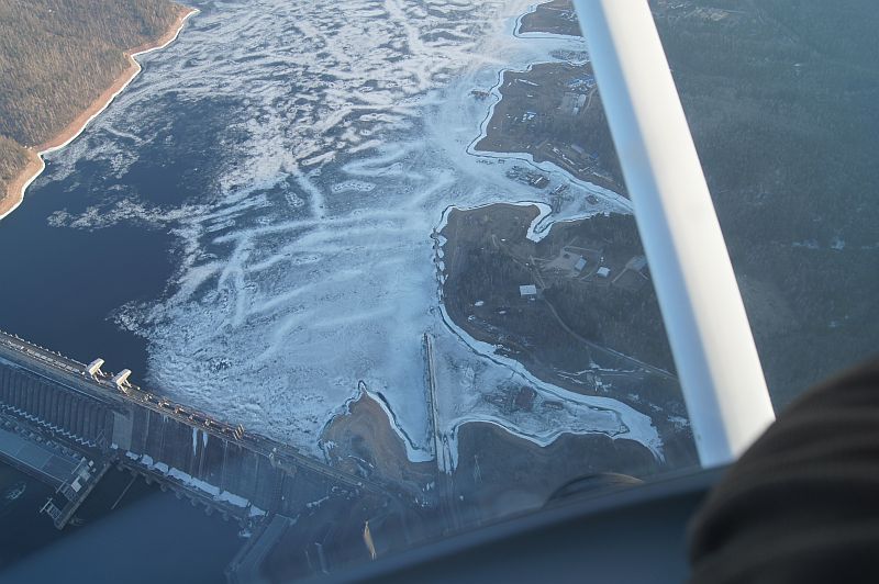 Под крылом город Дивногорск, Красноярская ГЭС, красноярское море (еще не отошедшее от льда)