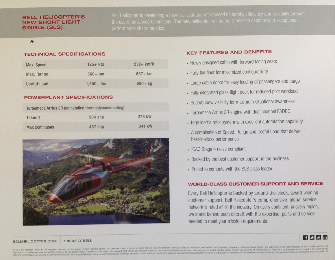 PARIS, FRANCE (June 17, 2013) – Today at the 2013 Paris Air Show, Bell Helicopter, a Textron Inc. company (NYSE: TXT), announced its return to the short light single (SLS) engine helicopter market with a new product designed to specifications based on the input of a customer advisory council. Bell Helicopter’s new, five-seat entry-level aircraft is expected to complete its first flight in 2014 with certification to follow as quickly as possible.