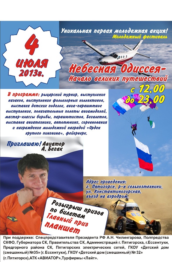 Добрый день! Приглашаем желающих!!! 4 июля с 12:00 до 23:00 в городе Пятигорске на аэродроме "Южный" будет проводиться Молодежный фестиваль "Небесная Одиссея". В программе: рыцарский турнир, выступление казаков, выступление фольклорных коллективов, выставка детских поделок, авиа-парашютное выступление, показательные полеты авиамоделей, мастер-классы борьбы, выставка Бегалетов, выставка авиа-техники, автотюнинг, соревнования и награждение молодежной наградой "Орден крутого пингвина", фейерверк.