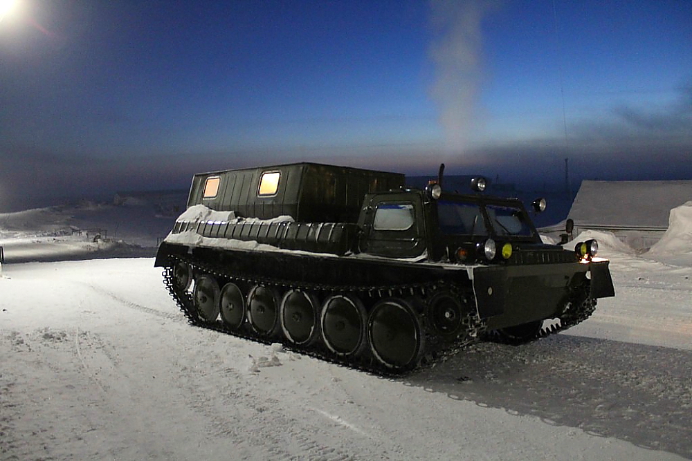 Транспорт на Диксоне вездеходный и моего товарища, Валерия Савина, работающего на приводе аэропорта, отстоящего от жилого поселка за 5 км, возит на работу вот такой красавец. Правда, в летнее время такие вездеходы просто режут тундру гусеницами, оставляя борозды-следы в ней на десятки и сотни лет.