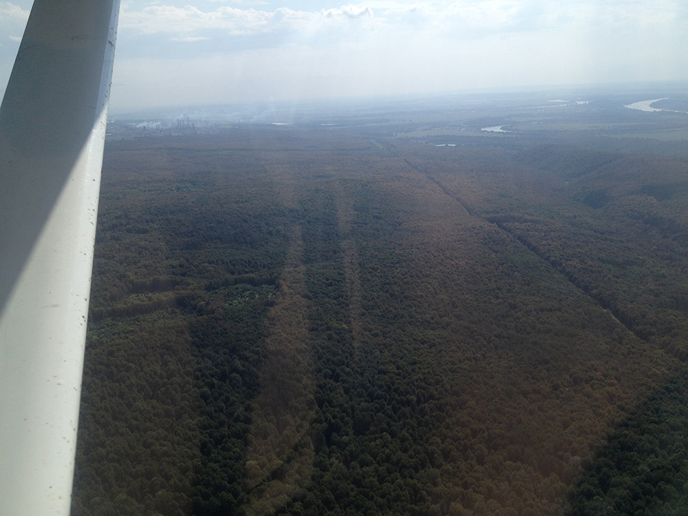 Подали заявку на Уфу, взлетели. Самый на мой взгляд сложный участок - Урал. По пути встречались странные лесонасаждения круглой формы. И кому это было надо?