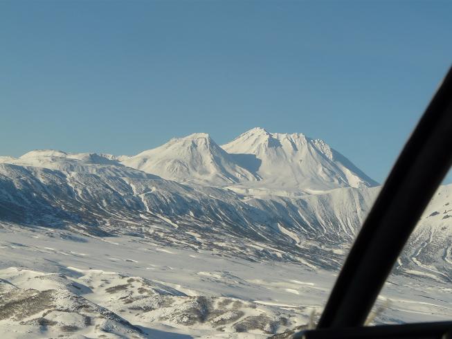 Далее планировалась посадка в Долине гейзеров. Но, как часто бывает на Камчатке, погода и направление ветра изменились, и мы побоялись там садиться из-за малого остатка топлива. Ограничились фотосессией с воздуха.
